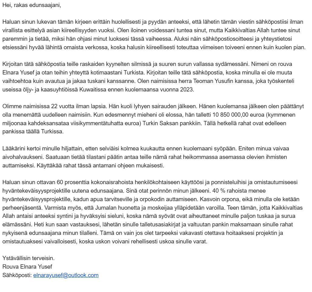 Sähköpostitse, tekstiviesteillä ja edelleen joskus myös kirjeitse lähetetään huijauskirjeitä, joissa yritetään huijata rahaa erilaisilla peitetarinoilla. Näitä kirjeitä kutsutaan usein myös…