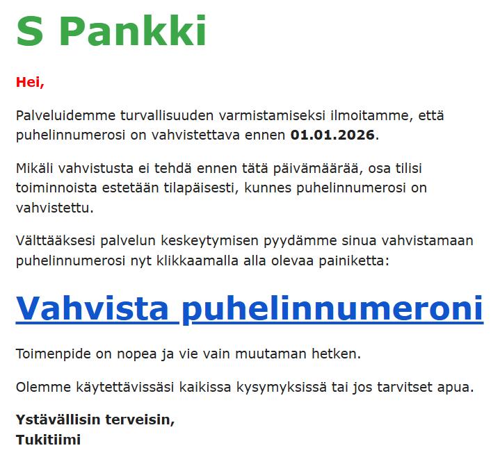 Pankkien nimissä tulee jatkuvasti huijausviestejä, katso aina lähettäjän osoite äläkä koskaan mene pankkiin sähköpostin tai tekstiviestin linkin kautta. lisää aiheesta: Nordea OmaSP Osuuspankki POP…