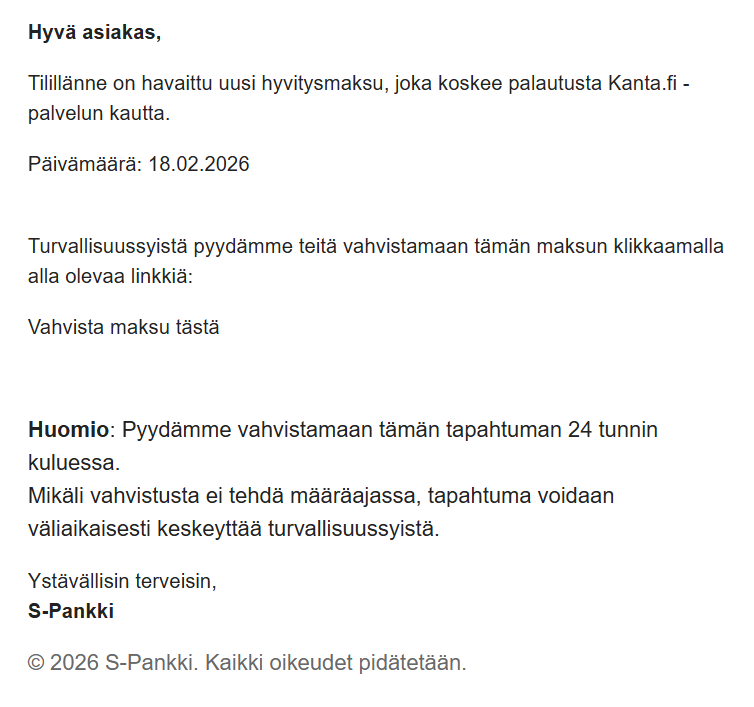 Pankkien nimissä tulee jatkuvasti huijausviestejä, katso aina lähettäjän osoite äläkä koskaan mene pankkiin sähköpostin tai tekstiviestin linkin kautta.